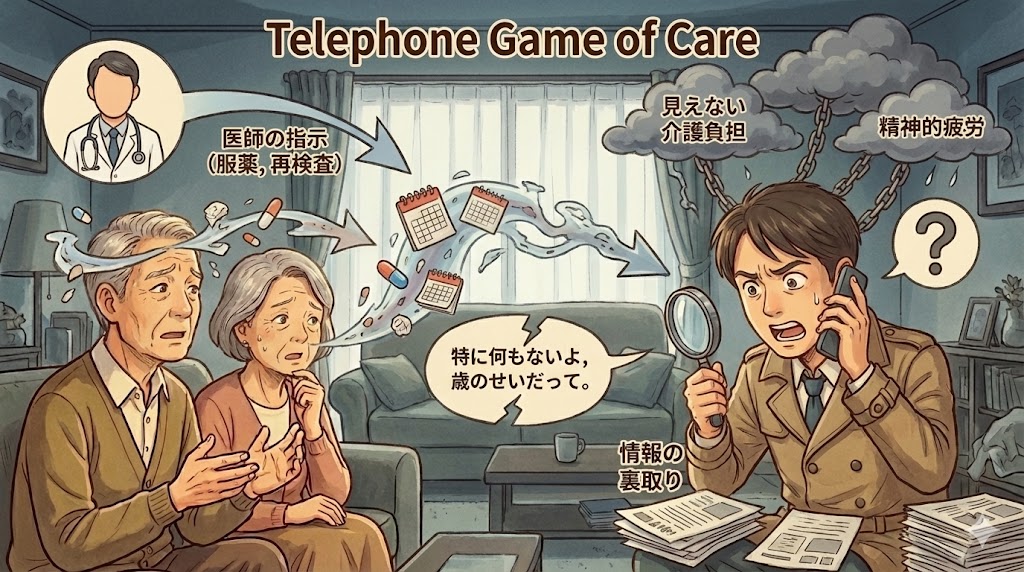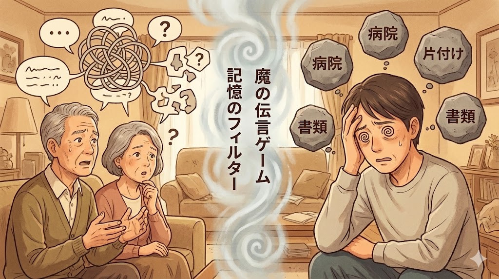 医師という情報の出し手から、親という中継地点を経由して、あなたという受け手に届くまでの間に、情報は抜け落ち、変形してしまいます。 これが、家族を混乱させる伝言ゲームの実態です。