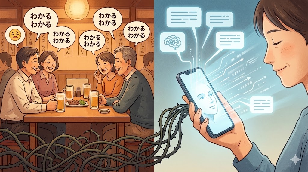 共感してもらうことで、一時的に心は軽くなります。ドーパミンが分泌され、ストレスが発散されたように感じるかもしれません。これを私は**「井戸端会議(または居酒屋談義)のセラピー効果」**と呼んでいます。